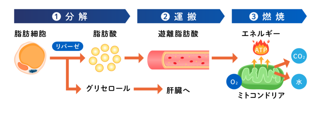 分解された脂肪酸は血液に入り、筋肉などのエネルギーとして使われる場所へ移動します。